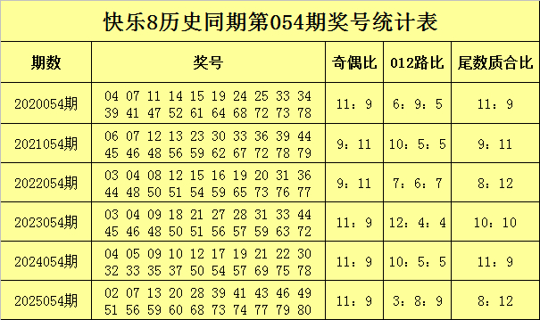第19、20位号码分析:历史同时第054期散布在63-80之间,其中奖号奇偶比为6:6、012路比为6:4:2、余数质合比为5:7,前年同时开出奖号:79和80,为奇号+偶号、1路+2路、全合尾组合,本年第054期预测第19、20位开独特号+偶号组合,参考两码61+66。