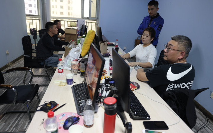 该营销点位于一幢三室二厅的小区单位房里,客厅四张桌子不绝,桌面摆放着8台电脑,一间屋子被装修成直播录制室。