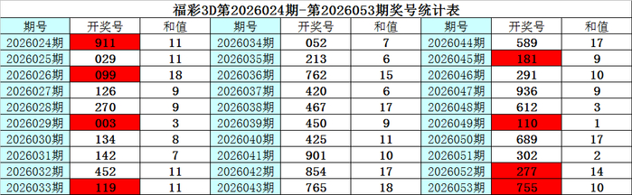 上期转头:福彩3D第2026053期奖号为:755,其中奖号组选类型为:组三,奇偶比为3:0,大小比为3:0,012路比为0:1:2,和值为17,跨度为2。