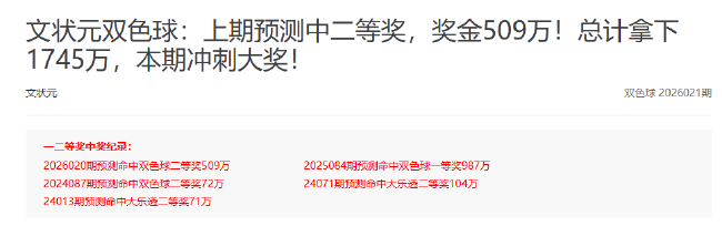 文状元不异在第2026020期掷中双色球二等奖豪揽509万奖金,入驻平台以来他还曾掷中双色球一等大奖,实力斐然值得蔼然![稽查最新保举]