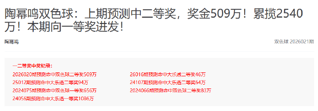 行家陶幂鸣在2026020期掷中一谈红球号码,喜提二等奖,凭借15+5大复式,拿下5注二等以及多注小奖,共揽得509万,快乐彩奖金成色堪比一等!他此前还曾掷中过一次双色球一等和一次双色球二等,今晚将继续向大奖发起冲击![稽查最新保举]