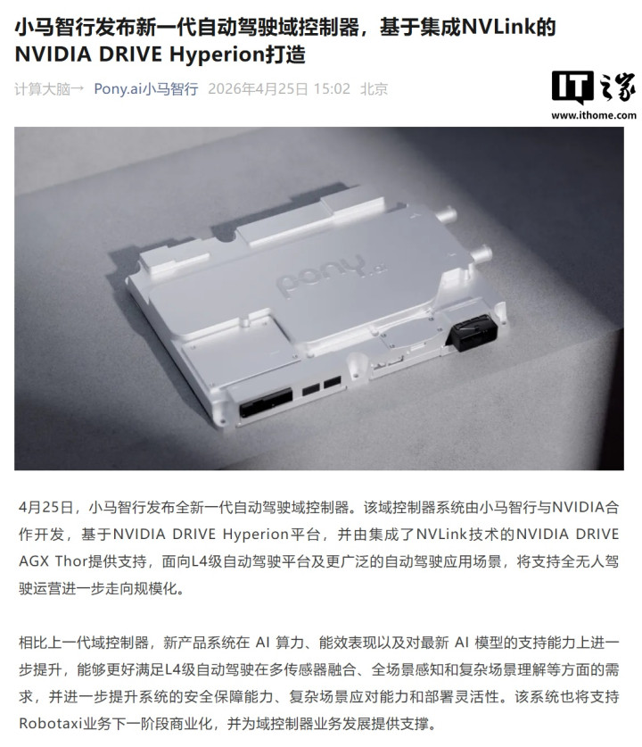 IT之家4月25日音尘,小马智行今天发布全新一代自动驾驶域截止器,基于英伟达DRIVEHyperion平台打造,面向L4级自动驾驶平台及更平庸的自动驾驶愚弄场景。