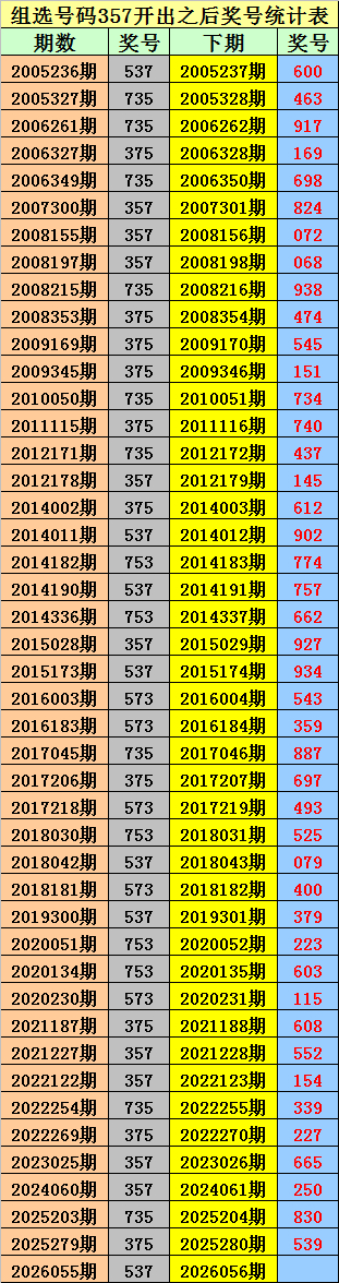 罗列三组选357出现之后下期分辩开出:600、463、917、169、698、824、072、068、938、474、545、151、734、740、437、145、612、902、774、757、662、927、934、543、359、887、697、493、525、079、400、379、223、603、115、608、552、154、339、227、665、250、830、539。