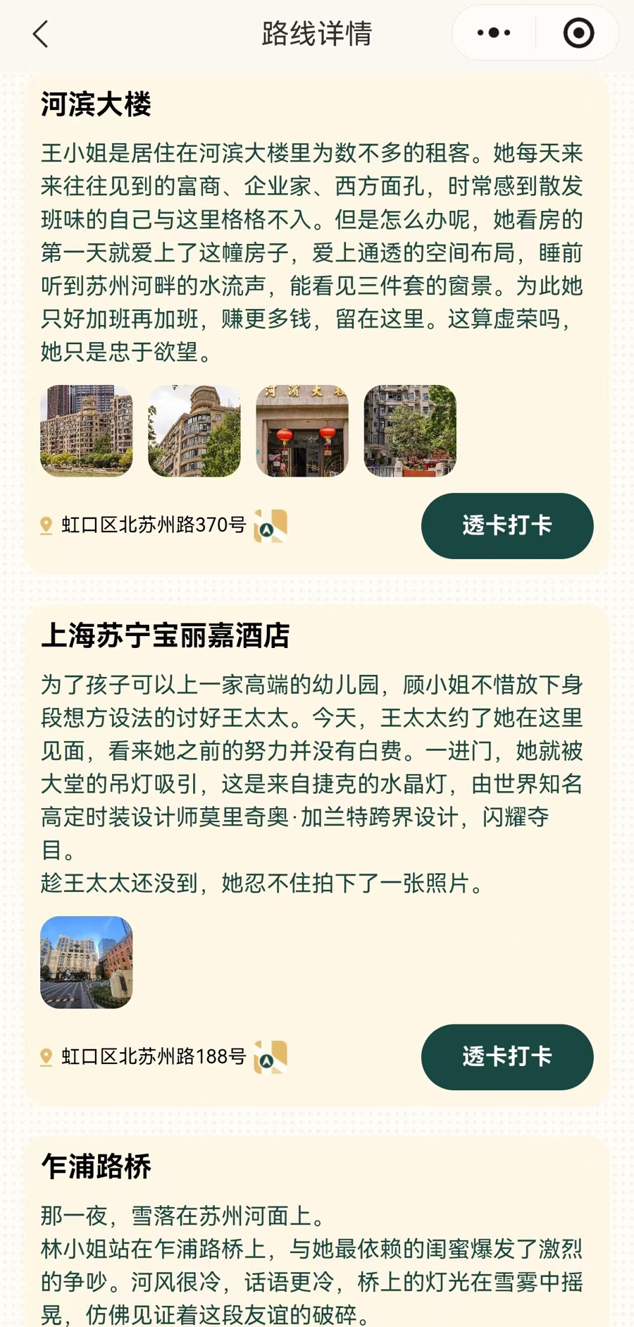 如今,外部修缮一新的河边大楼不仅是网红打卡地,亦然浩繁影视剧的热点取景地。“影视剧中上海高等白领住的公寓常常在这栋楼里取景,它某种进度上平静了不雅众对独处独身女性概括活命空间的念念象。”石川说。奴婢小举止中《影剧东说念主生:她的24帧》的故事线,不雅众不错在行走中解锁那些曾“居住”于此的剧中变装,并使用“电子透卡”精确定位影视剧经典取景框,快乐彩app官方下载使用造谣透卡与实景类似拍照,归附影视场景。比如在河边大楼的门口,就不错拍摄一张《三十长途》中的王漫妮同款透卡。
