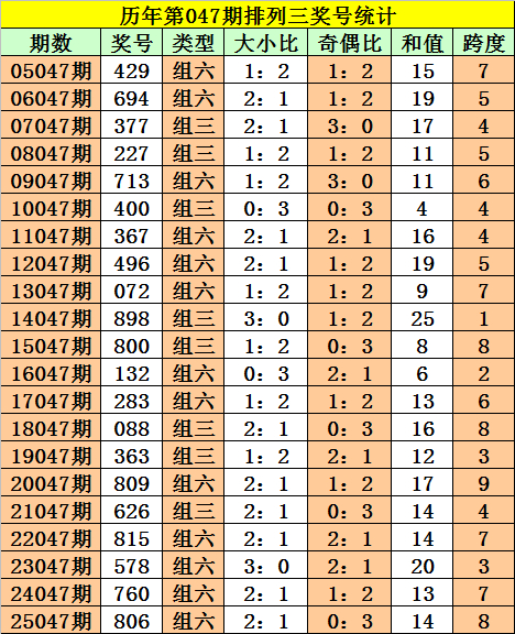 积年第047期奖号中:组三开出8次,组六开出13次。组三、组六走势特等,本期方式组三。