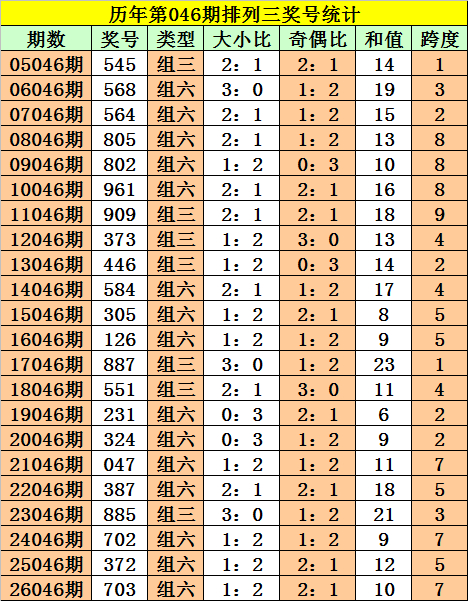 陈设三第2026046期奖号:703,和值10,跨度7,大小比1:2,奇偶比2:1。