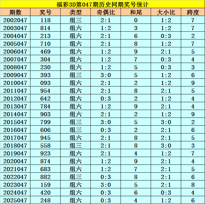 福彩3D从2002年开奖于今已开出了8554期奖号了,本期为2026年第047期开奖,历史上第047期已开出24次奖号了: