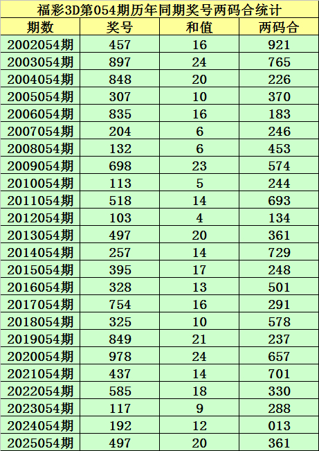 福彩3D第054期,历史上期开出24次奖号,其奖号诀别为:457、897、848、307、835、204、132、698、113、518、103、497、257、395、328、754、325、849、978、437、585、117、192、497,奖号两码合差诀别开出: