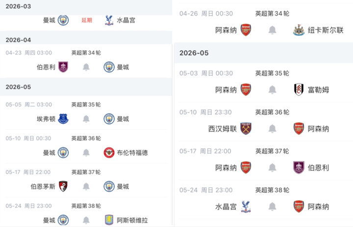 曼城:先是周中补赛客战左迁区球队伯恩利,临了4轮折柳是客战埃弗顿、主战布伦特福德、客战伯恩茅斯、主战阿斯顿维拉。