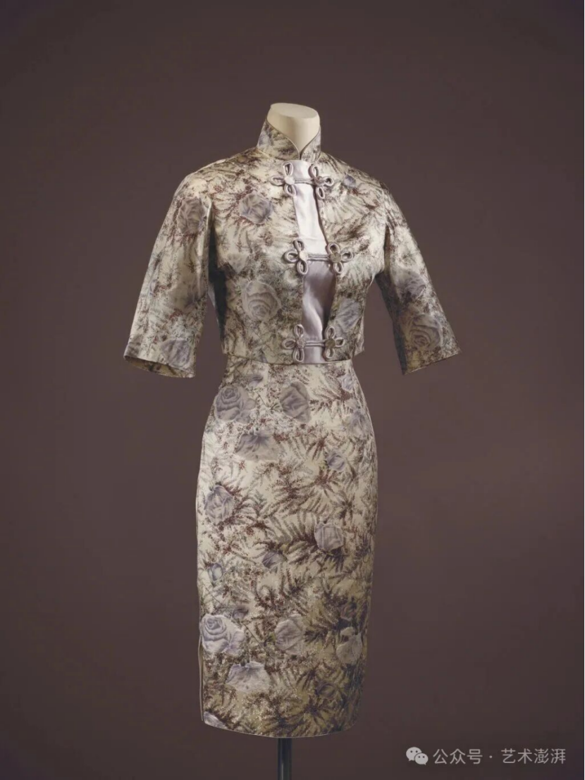 白地浅紫色玫瑰纹提花印花绒旗袍套装 20 世纪70 年代 上海博物馆藏 2021年贝洽女士捐赠