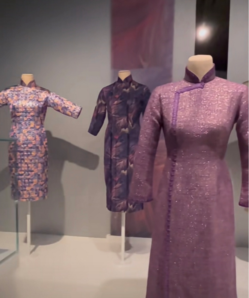 两年之后,她又买了一辆淡紫色的车,于是她又会穿淡紫色的衣服来搭配。你们在展览中看到的那些淡紫色旗袍,恰是她最钟爱的脸色。