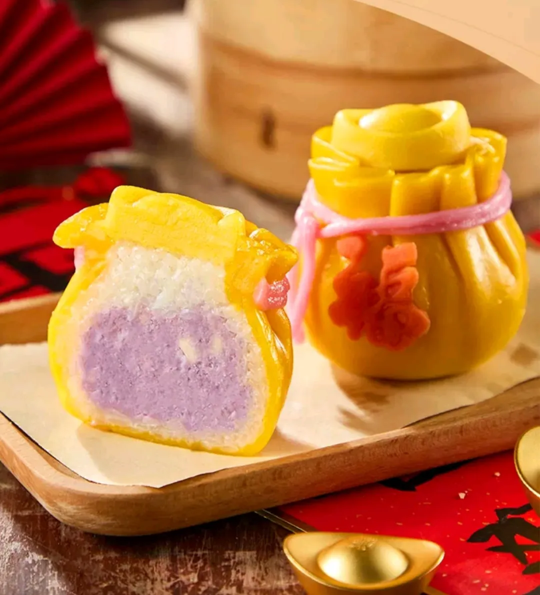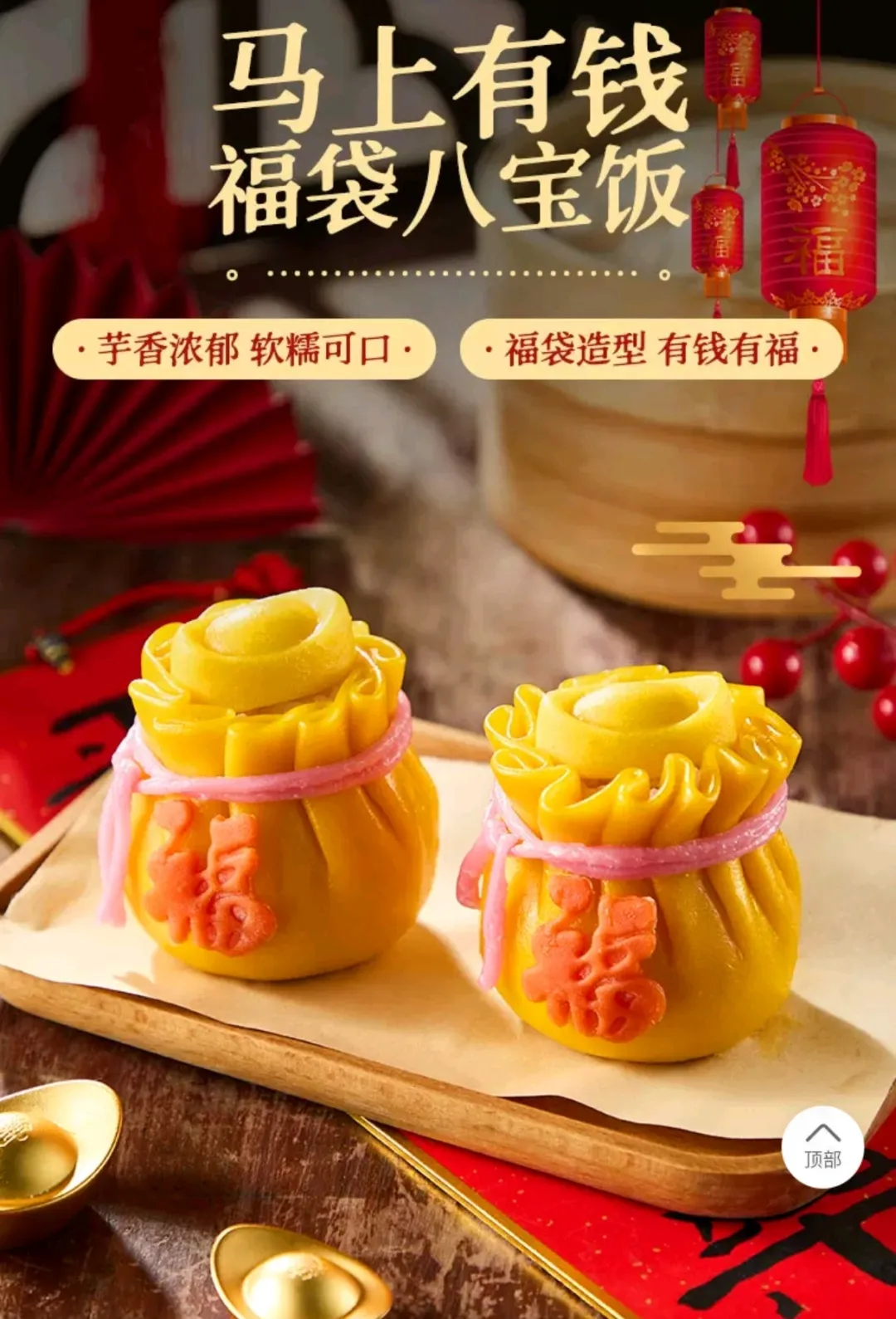 这个造型真的让东说念主咫尺一亮!外面是金黄色的福袋头上顶着金元宝内部竟然是八宝饭?!这个idea有点酷爱~