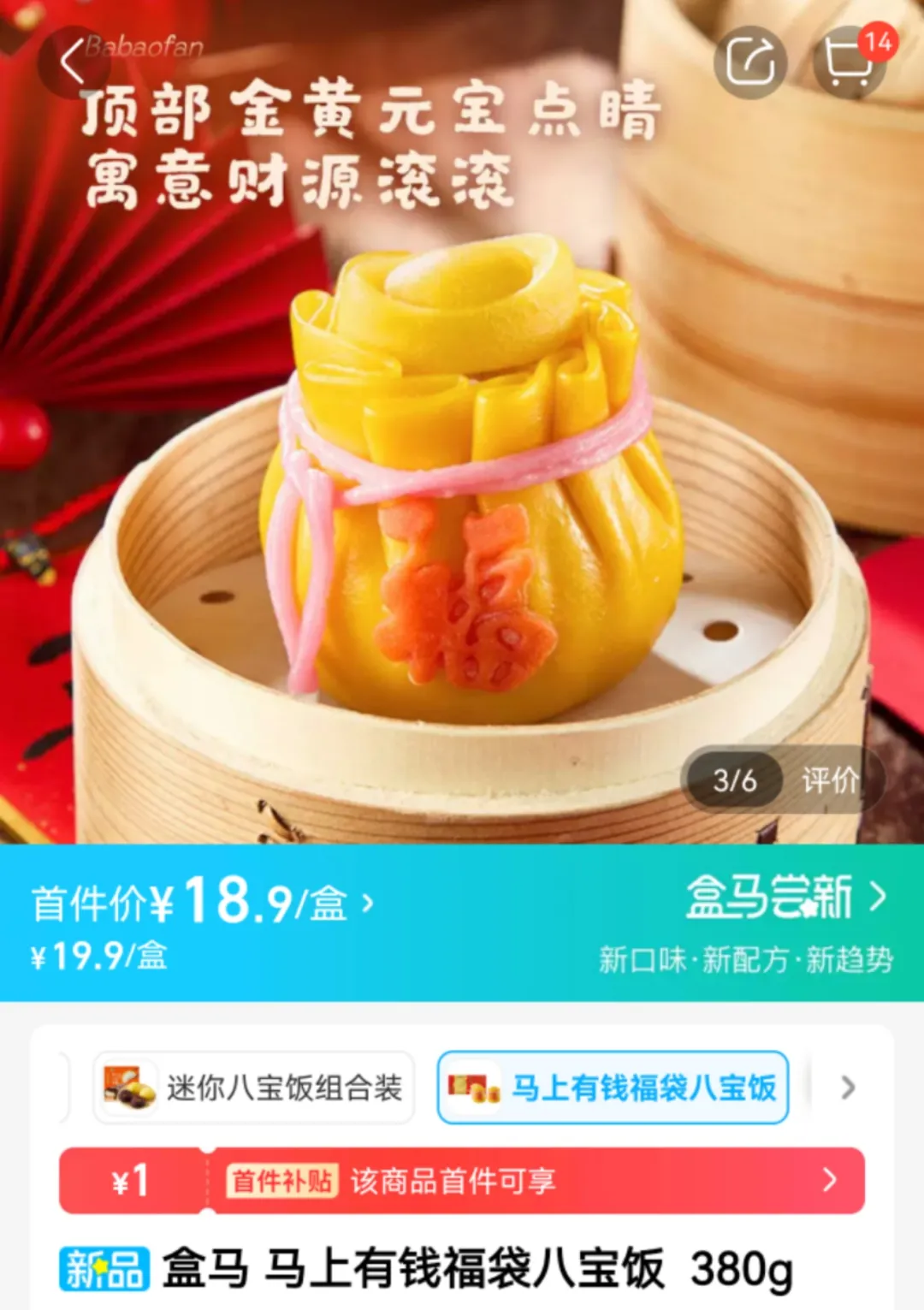 {jz:field.toptypename/}元旦新年到啦!马年新春也越来越近~节日氛围日渐浓郁小侬近日发当今电商平台上多样充满新年氛围的意旨创意商品王人红红火火地上架啦!全部来望望哪一款最讨你的欢心?盒马平台来岁是马年“盒马”算不算是本命年?哈哈哈虽然要加大“马力”推新品啦!盒马·惟恐有钱福袋八宝饭