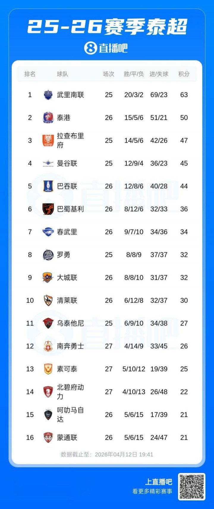 直播吧4月12日讯泰超本周末张开多场补赛争夺,武里南联提前夺冠。