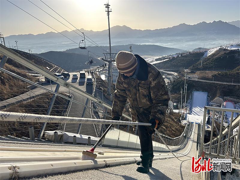2月11日,在涞源县国度跳台滑雪检会科研基地的滑雪跳台上,牛泽葳正在清扫助滑谈上的冰渣。河北日报见习记者李靖恬摄