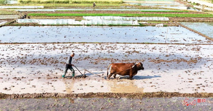 2026年4月19日,湖南省永州市江永县上江圩镇甘益村,农民赶牛犁田。(田如瑞摄/光明图片)