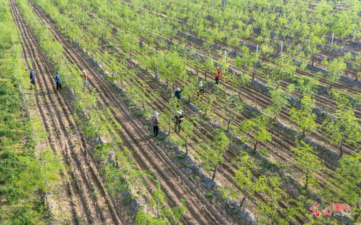 2026年4月19日,山西省运城市盐湖区解洲镇西辛庄村酸枣莳植基地,农户正抢持农时,开展春季修芽整形、疏枝定干等田间贬责功课。(杨建峰摄/光明图片)