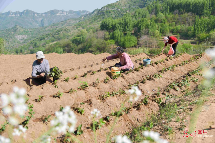 2026年4月19日,山东省青州市庙子镇农民在田间栽植红薯。(王继林摄/光明图片)