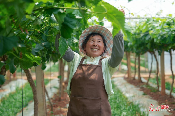 2026年4月19日,在云南省曲靖市陆良县青春镇雍家村"阳光玫瑰"葡萄莳植园里,果农正开展疏花整穗、绑枝固蔓等管护责任。(王勇摄/光明图片)