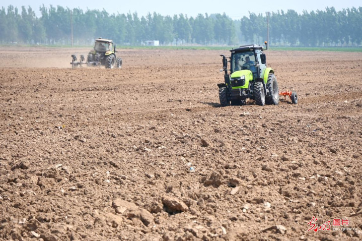 2026年4月19日,河南省开封市城乡一体化示范区水稻乡双河铺村一莳植基地,农机手正在耕田耙地准备莳植早茬玉米。(李俊生摄/光明图片)
